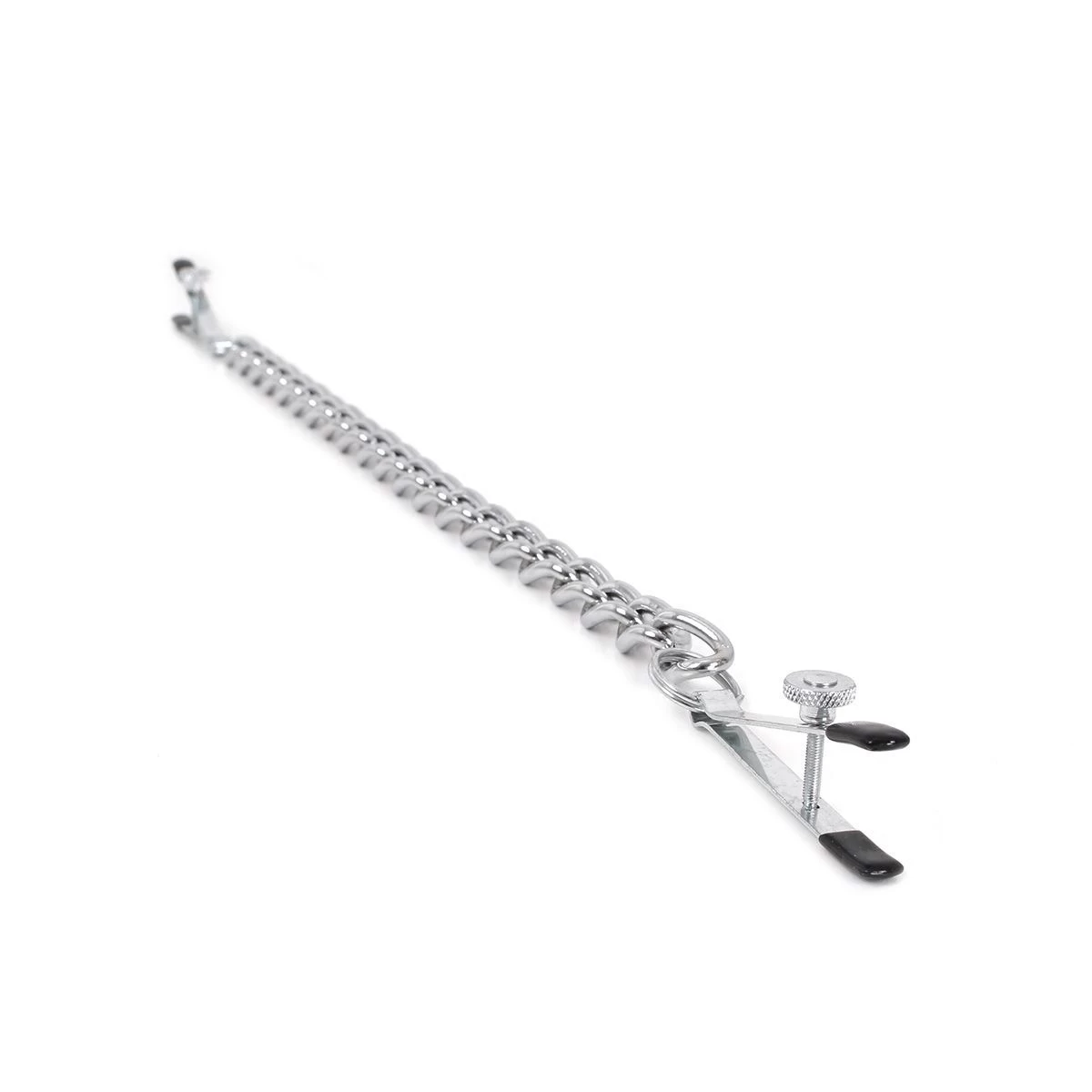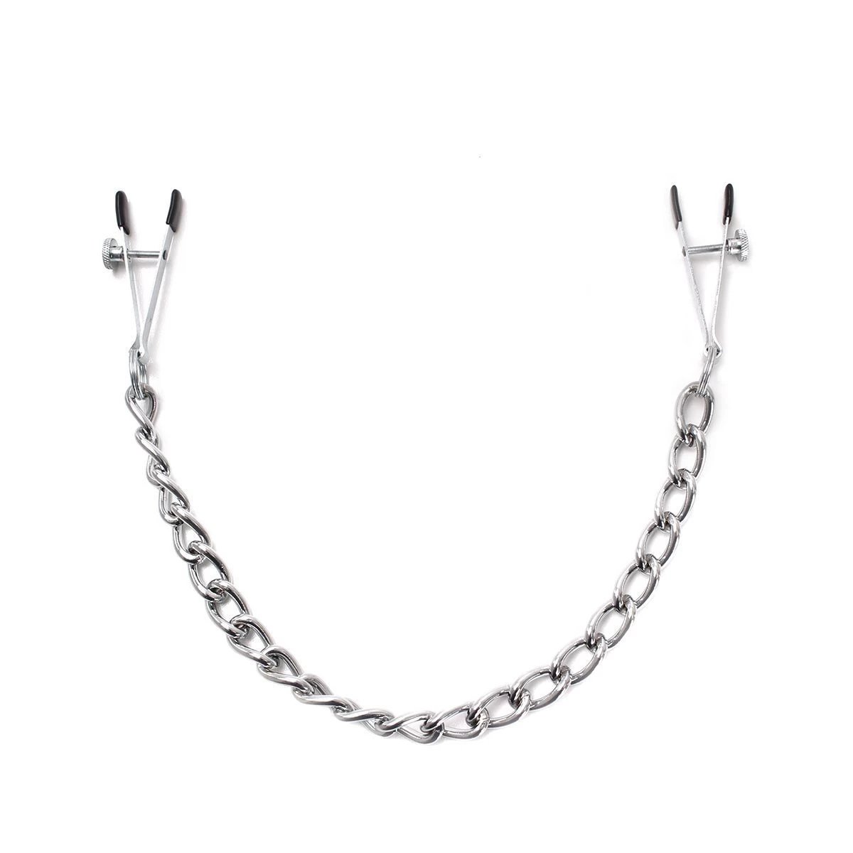 Geef je seksleven een kinky boost met deze Kiotos tepel klemmen met zware ketting. De producten van Kiotos zijn van hoogwaardige kwaliteit en gaan lang mee. Deze stoere tepel klemmen zijn gemaakt van metaal en hebben siliconen bescherm nopjes om de klemmen heen waardoor het zachter aanvoelt voor de tepels. Dit maakt de tepel klemmen niet minder uitdagend, want het zware metaal van de ketting trekt aan de tepels en je kunt de klemmen strakker draaien door middel van de verstelbare schroef. Geef je helemaal over aan de heerlijke combinatie van genot en pijn of laat zien wie de baas is wanneer je deze kiotos tepel klemmen met zware ketting bij je partner gebruikt.